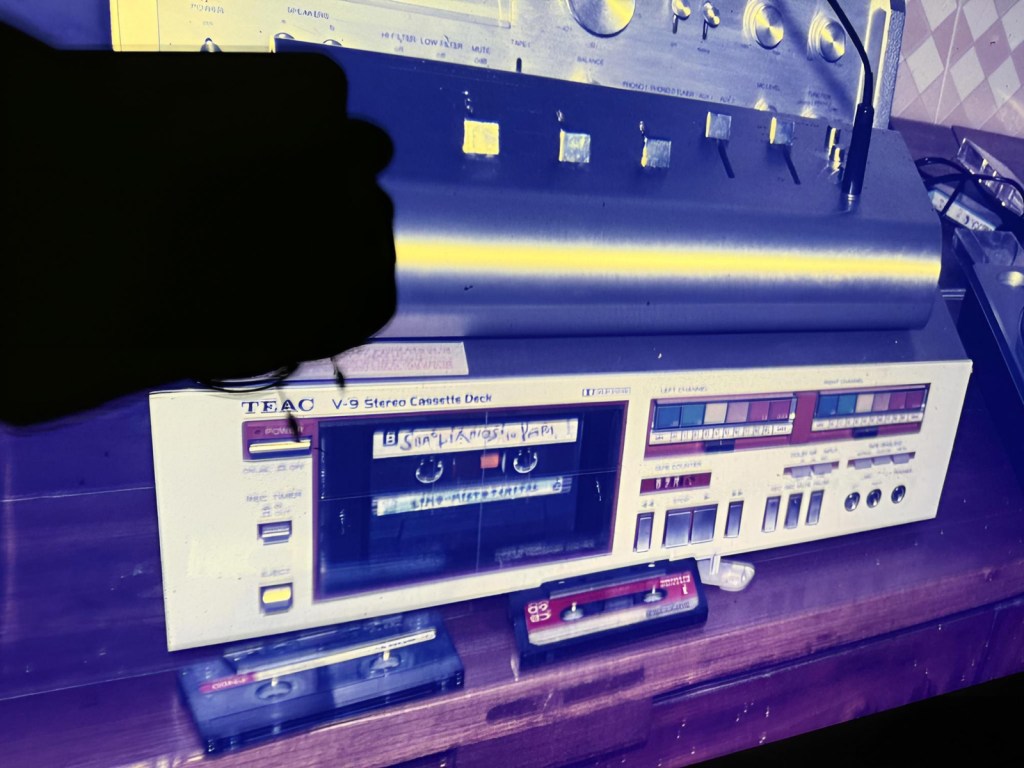 Due estremi che si sfiorano, letteralmente: una istruita piastra, o “rack” o come le chiamavate voi le piccole torri fatte di apparecchi per ascoltare, registrare, duplicare musica e una originale audiocassetta del 1984 recante in se stessa il primo demotape di LMT: “Sbagliandosi in para“. La siensa ci informa che materie tipo il polistirene impiega circa un millennio per degradarsi e scomparire; le cassette smarze messe in giro dai Mistoterital rischiano di permanere molto di più. Colpa e vituperio.