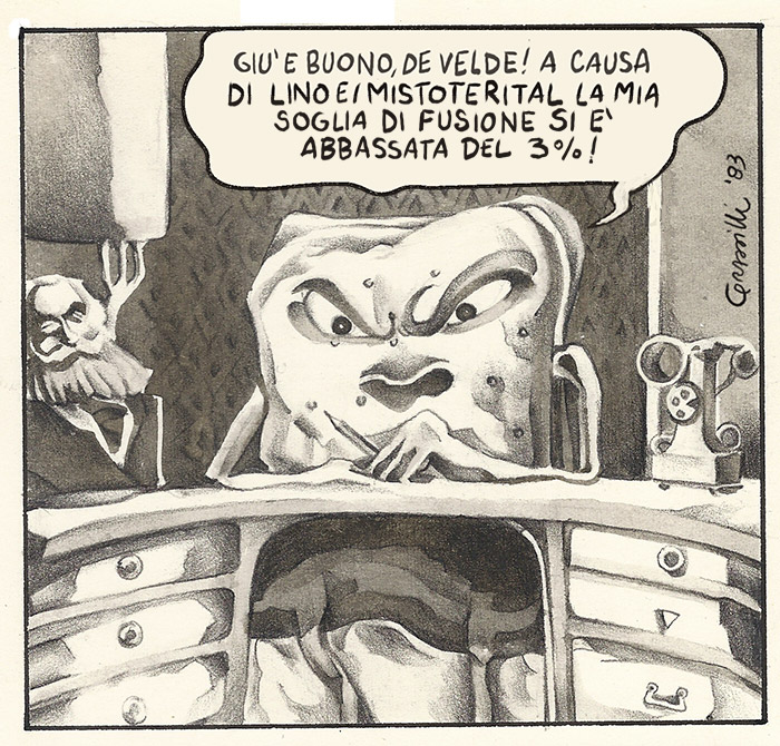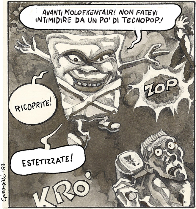 “I nemici storici dei Mistoterital! [ride] Il capo si chiamava Big Camillino. Adesso mi fai tornare in mente queste operazioni criminali… Big Camillino era il risultato di un incidente nucleare in una fabbrica di gelati. Era un esteta totale e odiava Lino e i Mistoterital per la loro completa inesteticità, per la loro incapacità di essere coerenti con stili, gusti, modi di vestire, eccetera. Invece questo Big Camillino pretendeva di essere un neo-preraffaelita, cose così, e odiava Lino e i Mistoterital. Era una cosa proprio da fumetti. Fatto sta che Big Camillino cercava di boicottare il ‘Belushi Day’, facendo non so bene cosa, una roba sulla ‘pressione giorgiosferica’ della città…”