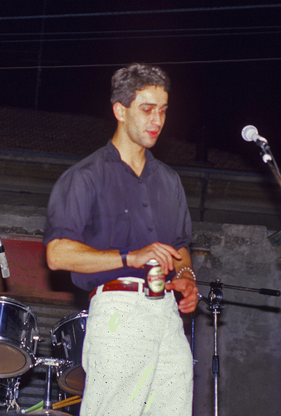 Vanni Ottanta, prezioso roadie-tecnico di LMT in quel primo periodo di esibizio, 29 settembre 1985, per l’inaugurazione dello “Screen video club”, circolo Arci di Copparo (Fe). Qui il link a un frammento sonoro, in feroce bassa fedeltà, ma in grado di restituire il tono della serata: http://00468f7.netsolhost.com/LMT/songobucco/mp3/Rares_Live/BHCopparo_Live85.mp3