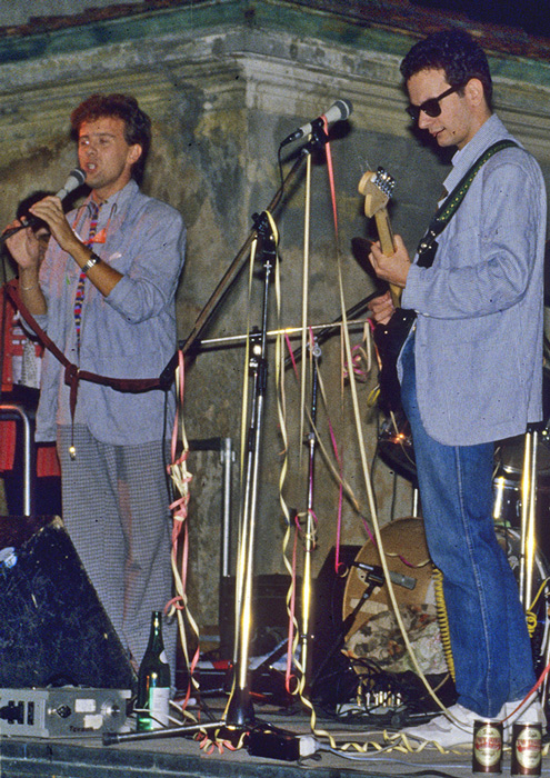 Esibizione nr.20, 29 settembre 1985, per l’inaugurazione dello “Screen video club”, circolo Arci di Copparo (Fe). Qui il link a un frammento sonoro, in feroce bassa fedeltà, ma in grado di restituire il tono della serata: http://00468f7.netsolhost.com/LMT/songobucco/mp3/Rares_Live/BHCopparo_Live85.mp3