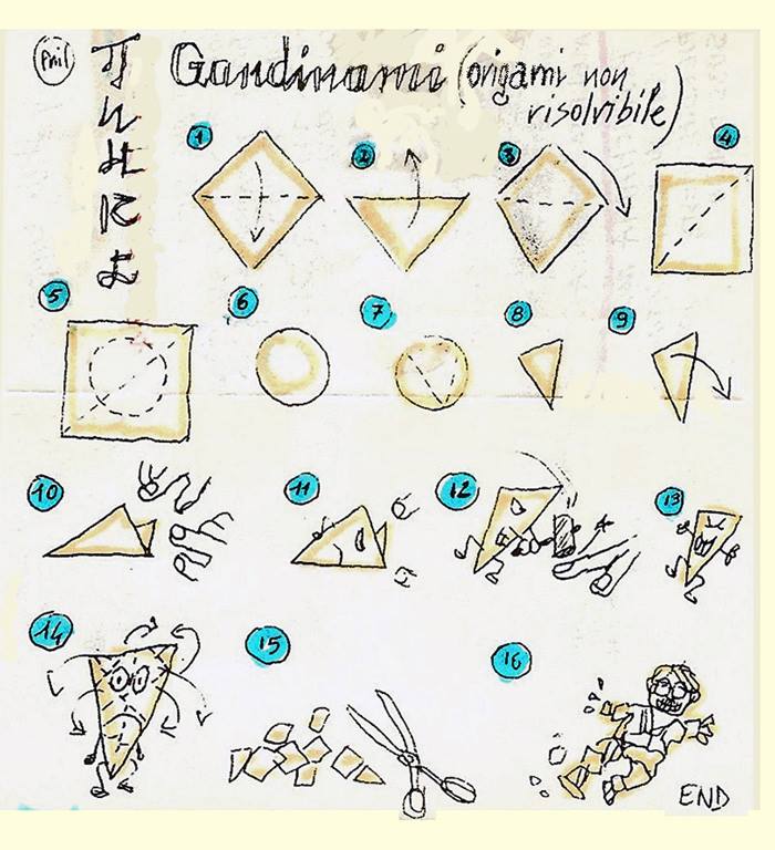 Gandinami non risolvibile contenuto nella confezione dell’audiocassetta detta “Beverly Hills Copparo”, (LMT’s esibizio del 29 settembre 1985, per l’inaugurazione dello “Screen video club”, circolo Arci di Copparo (Fe)). Qui il link a un frammento sonoro, in feroce bassa fedeltà, ma in grado di restituire il tono della serata…