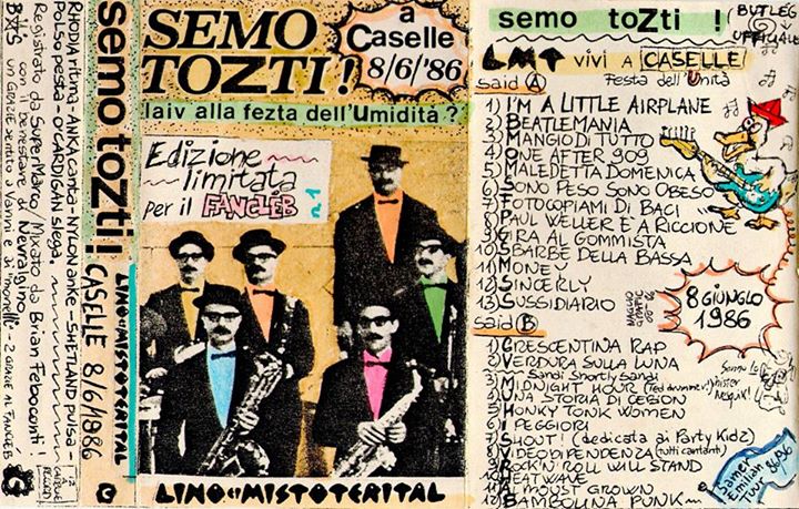 Copertina e side B della musicassetta autoprodotta (Butleg uffiziale) edizione limitata per il Fancleb con il live a Caselle di Crevalcore 8/6/1986 alla Festa dell’Unità denominato “Semo Tozti!”. Carbone Records (Nylon grafica)