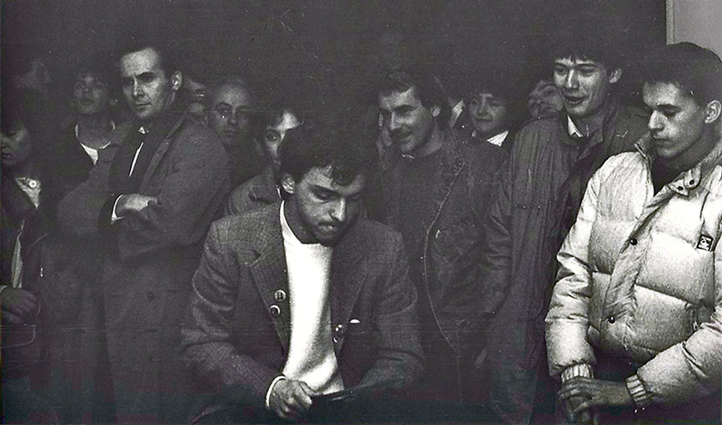 Paul Syno attorniato da una severa commissione della comunità europea che deve sincerarsi se i nostri sono Mod Doc. Sulla destra, “The Paul Syno’s Shadows”. “Quadroimphamia”: Lino e I Mistoterital ragazzi amModo! Pieve di Cento (Bo), 23 marzo 1985. — con Syno Senior, Paul Syno, Fabio Gurioli e Lou Maka