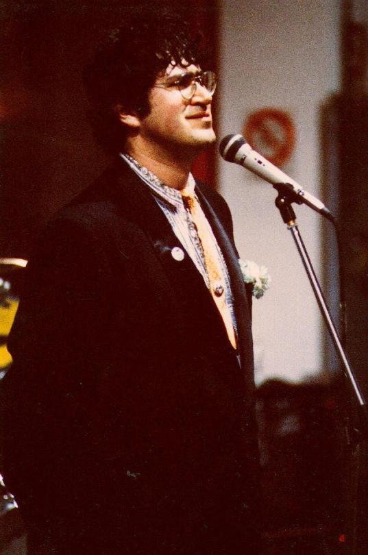 Festa di presentazione per l’uscita di “Bravi Ma Basta”, deposito delle Locomotive FS, Bologna, 25/06/1988. Ted Nylon sta per pronunciarsi.